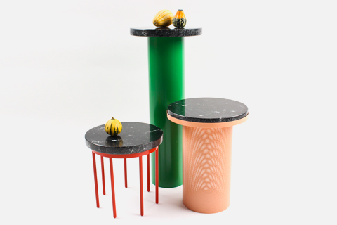 Es ist die schroffe und wilde Natur Norwegens, die Vera Kleppe und Åshild Kyte zu ihren Leuchten, Bänken, Regalen, Tischen und Glasobjekten inspiriert. Die Leuchte „Topiary“ beispielsweise sieht aus wie ein Baum. Dabei ist sie so flach, dass sie fast zweidimensional wirkt – wie bei Zeichnungen in Kinderbüchern. Überraschend ist, dass die beiden, die an der Bergen Academy for Art and Design studiert und 2012 ihr Studio in der norwegischen Küstenstadt gegründet haben, nicht mit Holz, sondern mit Metall arbeiten. Und ihren Objekten verpassen sie solch einen bunten Anstrich, wie wir ihn zuletzt bei Memphis in den 1980er Jahren gesehen haben.