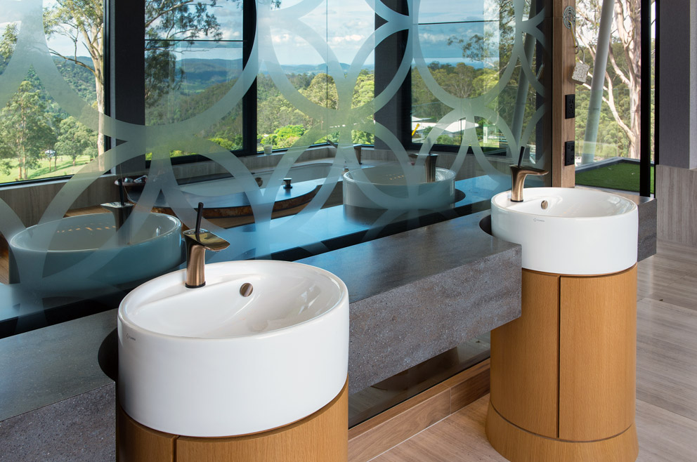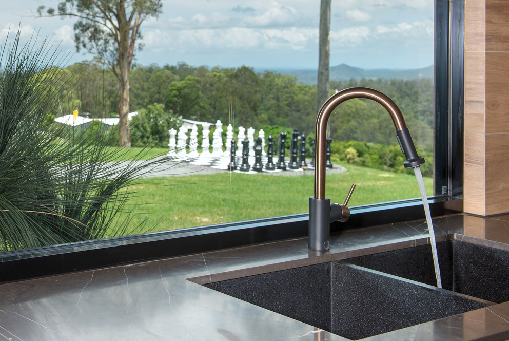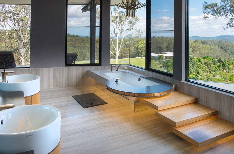 Baden ist ein herrlich entspannendes Erlebnis – besonders dann, wenn man dabei einen wunderbaren Ausblick genießen kann. Wie beispielsweise im Wohnhaus „Campbells Pocket“, das der Interior Designer Mark Gacesa von Ultraspace gestaltet hat. Mitten im australischen Moreton Bay – einem Landstrich unweit von Brisbane – befindet sich zwischen dicht bewachsenen Wäldern, grünen Wiesen und den Bergketten der Glass House Mountains ein wahres Paradies für Naturverbundene. Genießen kann man die reizvolle Landschaft nicht nur von der großzügigen Terrasse des luxuriösen Wohnhauses, sondern auch in den Innenbereichen, wo teils raumhohe Fensterfronten einen Panoramablick ins Grüne ermöglichen und das Haus zu einer wahren Erholungs-Oase werden lassen. Besonders die drei Tageslichtbäder laden zu langen Mußestunden ein. Schwarze, bronze- und goldfarbene Armaturen von Hansgrohe und Axor – der Designmarke von Hansgrohe – runden die geschmackvolle Innenarchitektur ab und zaubern im Bad ein stimmungsvolles Ambiente.