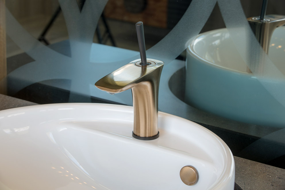Die goldfarbenen Waschtischmischer „Puravida 110“ mit praktischer Push-Open Ablaufgarnitur. Foto © Mark Gacesa of Ultraspace / Photographer: David Sproule