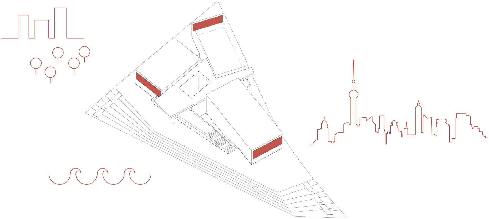 Chipperfield Architekten hat für die Bauaufgabe ein dreieckiges Grundstück zugewiesen bekommen. Eine exponierte Lage auf der Perlenschnur der Kultursolitäre. Die Architekten entschieden sich für drei Kuben, die wie Flügel eines Windrads um das doppelgeschossige Atrium rotieren. Alle Baukörper sind von gleicher Größe und Höhe – und offen für jegliche Formen von Kunst. Jeder der 17 Meter hohen Kuben besteht aus zwei Ebenen: Im Erdgeschoss ist eine Multifunktionshalle vorgesehen, darüber befindet sich ein Ausstellungsraum, der über Oberlichter erhellt wird. Großflächige Fenster an den Stirnseiten öffnen sich je nach Ausrichtung des Baukörpers zum Fluss oder zur Stadt. Die Fassaden bestehen aus Recyclingglasplatten und changieren im Tageslicht. Nachts leuchten die Kuben wie matt geschliffene Edelsteine durch das Licht im Inneren.