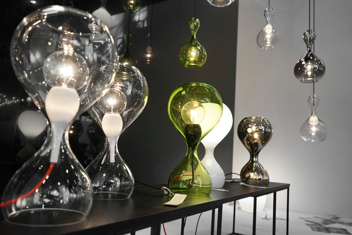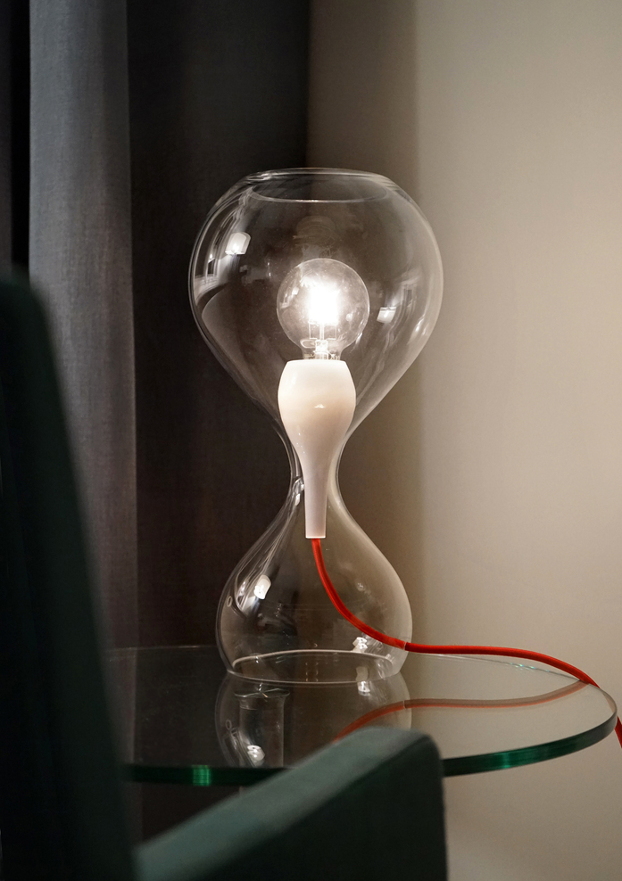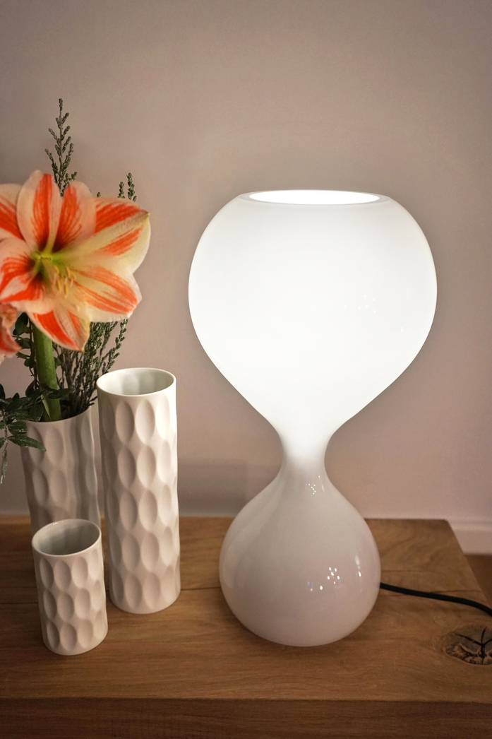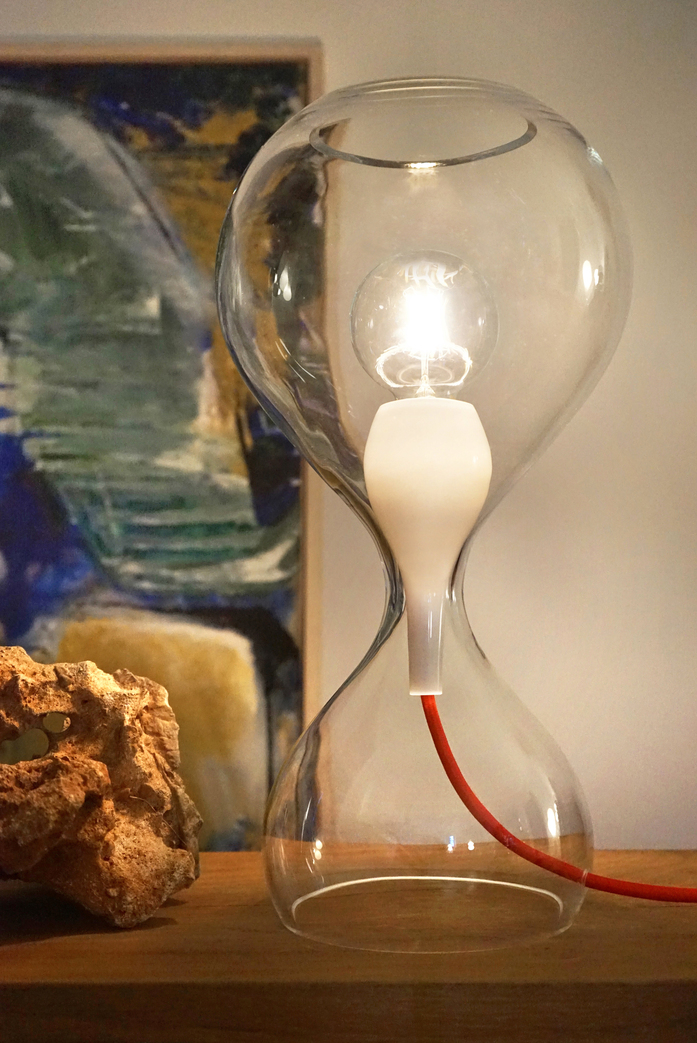 Ein auf's Wasser auftreffender Tropfen, die im Bruchteil einer Sekunde entstehnde Form eingefroren in Glas: Das ist BLUBB, die neue Leuchtenfamilie aus der Feder von Constantin Wortmann. Als Pendel- und Tischleuchte in klarem Glas offenbart die Leuchte ihr inneres Geheimnis: BLUBB_mini. Ein kleiner BLUBB aus opalem Glas umhüllt die Fassung uns ist solo so formschön, dass es in schwarz und opal auch als Einzelleuchte gibt. Die Tischleuchte in klar, opal, chorm oder limegrün ist mit Textilkabel in schwarz oder rot und einem Schnurdimmer für LED-Leuchtmitteln ausgestattet.