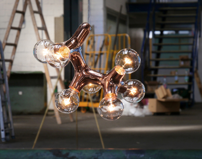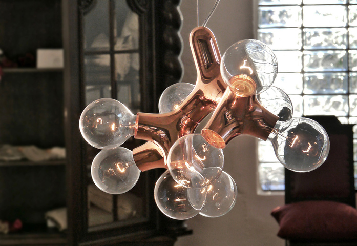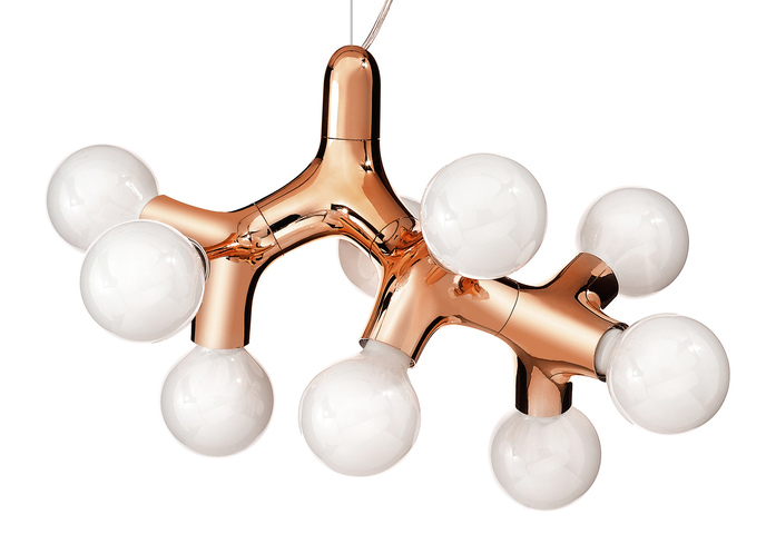 Wie eine organisch wachsende Struktur entwickelt sich die komplexe Form der Pendelleuchte aus einem überraschend einfachen Grundelement. Weiße, schwarze, verchromte oder verkupferte Kunststoffmodule mit jeweils drei Leuchtmitteln addieren sich zum Lichtobjekt in Wunschgröße, vom Singleformat bis zum raumgreifenden Kronleuchter. Sie haben die Auswahl zwischen sieben verschiedenen, konfektionierten Pendelleuchten, einer Tischleuchte, einer Wand-Decken-Leuchte oder einer individuellen, maßgeschneiderten Lösung. Ausgestattet werden die Leuchten mit Globe-Leuchtmittel in LED-Technik in opal oder mit den neuen Filament-Leuchtmitteln mit dem Charme der Kohlefadenlampen.
