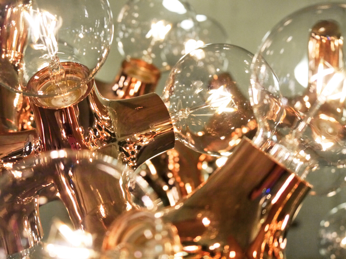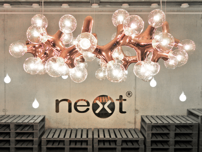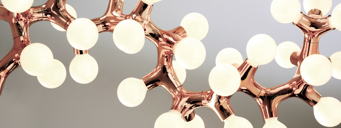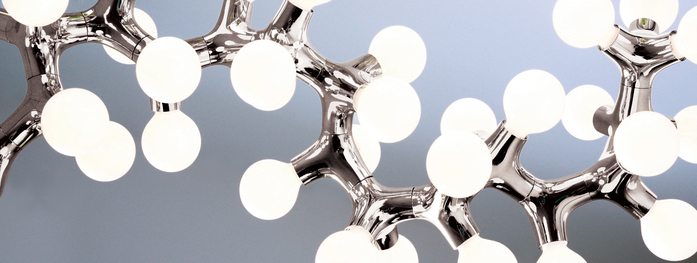 Wie eine organisch wachsende Struktur entwickelt sich die komplexe Form der Pendelleuchte aus einem überraschend einfachen Grundelement. Weiße, schwarze, verchromte oder verkupferte Kunststoffmodule mit jeweils drei Leuchtmitteln addieren sich zum Lichtobjekt in Wunschgröße, vom Singleformat bis zum raumgreifenden Kronleuchter. Sie haben die Auswahl zwischen sieben verschiedenen, konfektionierten Pendelleuchten, einer Tischleuchte, einer Wand-Decken-Leuchte oder einer individuellen, maßgeschneiderten Lösung. Ausgestattet werden die Leuchten mit Globe-Leuchtmittel in LED-Technik in opal oder mit den neuen Filament-Leuchtmitteln mit dem Charme der Kohlefadenlampen.