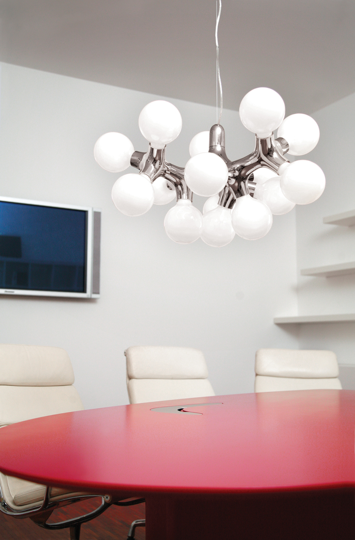 Wie eine organisch wachsende Struktur entwickelt sich die komplexe Form der Pendelleuchte aus einem überraschend einfachen Grundelement. Weiße, schwarze, verchromte oder verkupferte Kunststoffmodule mit jeweils drei Leuchtmitteln addieren sich zum Lichtobjekt in Wunschgröße, vom Singleformat bis zum raumgreifenden Kronleuchter. Sie haben die Auswahl zwischen sieben verschiedenen, konfektionierten Pendelleuchten, einer Tischleuchte, einer Wand-Decken-Leuchte oder einer individuellen, maßgeschneiderten Lösung. Ausgestattet werden die Leuchten mit Globe-Leuchtmittel in LED-Technik in opal oder mit den neuen Filament-Leuchtmitteln mit dem Charme der Kohlefadenlampen.