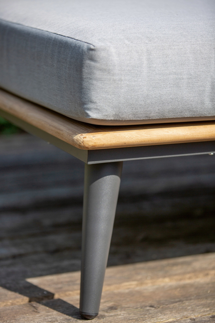 Geradlinig, minimalistisch und komfortabel – Die aktuelle SERRA Loungegruppe verfolgt eine klare Zielsetzung. Ohne sichtbare Arm- oder Rückenlehnelemente, dafür aber mit zarten Standfüßen aus Aluminium, strahlt SERRA eine ästhetisch-leichte Optik aus. Das außergewöhnlich schwerelose Erscheinungsbild stellt jedoch keinen Verzicht an Komfort dar. Mit einem verstellbaren Seitenteil lässt sich SERRA einfach in ein gemütliches Daybed verwandeln. Komfortable Polster mit einem wasserabweisenden Canvas Bezug in Lichtgrau bilden einen aktuellen Kontrast zum umlaufenden, natürlichen Teakholzrahmen. Bei der SERRA Loungegruppe handelt es sich um ein modulares System, welches individuell zusammengestellt werden kann. SERRA wurde erstmalig auf der Gardiente 2019 vorgestellt.