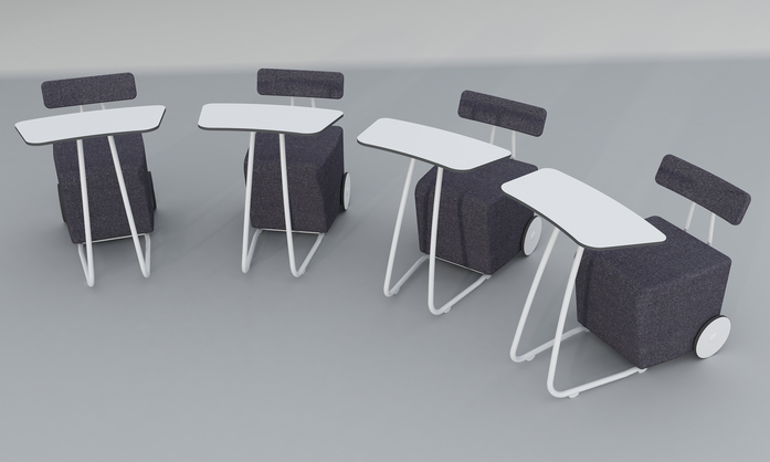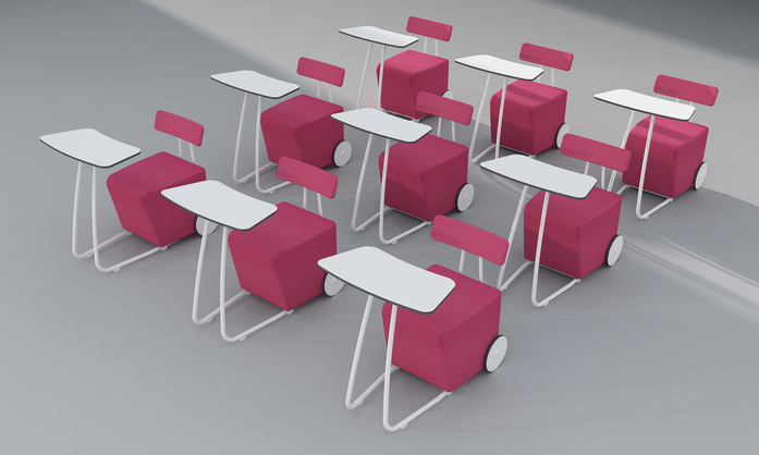 Oli is a cross functional design that meets both educational and collective working needs. With its inclined and 180 degrees rotatable writing desk, it provides ergonomic and flexible usage. Using the concave form of the desk as an advantage, in just seconds, a space can flex from individual mode to collective mode aligning the desks as a part of a circle. Since its seat can slide backward and forward, it is really easy to settle on leaving enough space for the whole action of sitting and getting up. It has the most user-friendly design which connects the desk to the pouf from the bottom part especially considering women with skirts.
