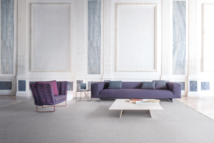 Atollo Next merges the traditional production techniques with the most innovative materials. Conceived for the maximum comfort, this sofa is padded with a 100% recyclable material. The bases are made of steel, either lacquered or Ornué finished, a special, exclusive hand brushed finishing by De Castelli. The removable upholstery cover is available in the many indoor fabrics in the collection.