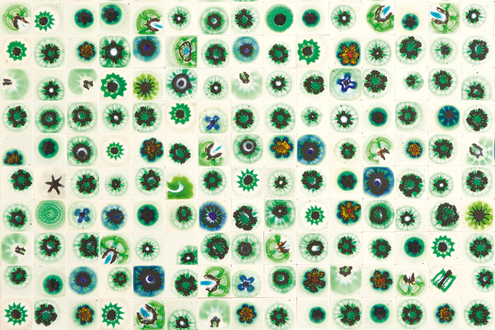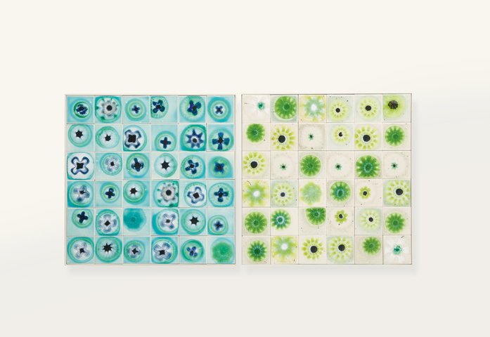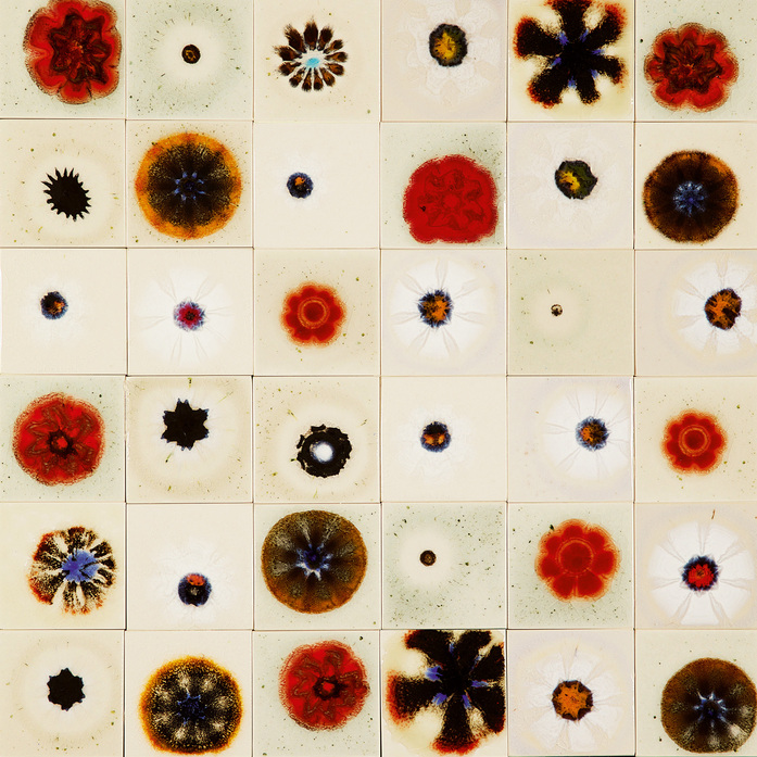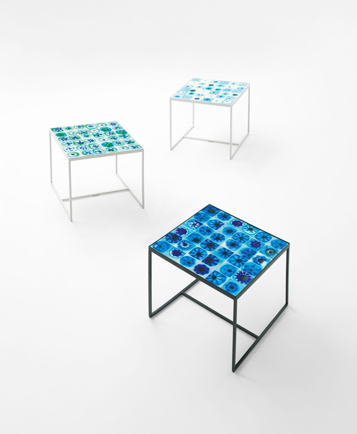 Bloom is a new series of side tables available in different dimensions. The stainless steel base is matt varnished in avorio colour. The top is composed of tiles decorated with glass. Each tile is a unique piece and compositions follow aesthetic criteria according to the colour hues obtained each time from the singular production technique.