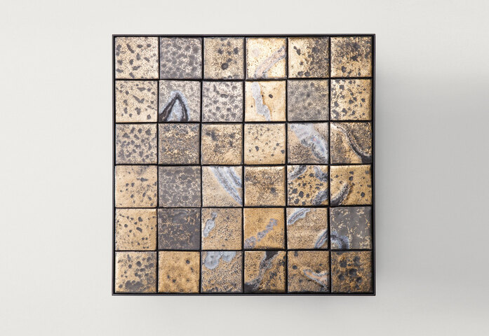 Nicolò Morales decorates the tiles by hand using a particular working technique to obtain unique oxidized and metallic effects. Each tile is a unique piece, which is selected to be combined to the other according to aesthetic criteria based on the colour shades created onto the surfaces. The structure is made of Délabré finished stainless steel, an exclusive finishing by De Castelli.