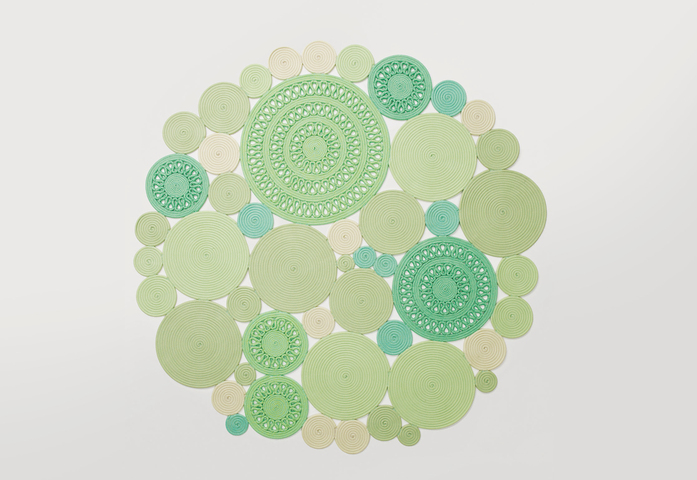 This rug is hand made with a Rope cord, Paola Lenti's signature material available in solid colours or in a twocolour combination. The cord is shaped and sewn to create spirals and stylized forms, which are then freely joined together. For standard production, only one colour or two-colour combination can be chosen among the options available for Rope Corda 10 in the sample collections “In the Key of Colour” and "Shades of White", but rug can be also easily customized upon request.