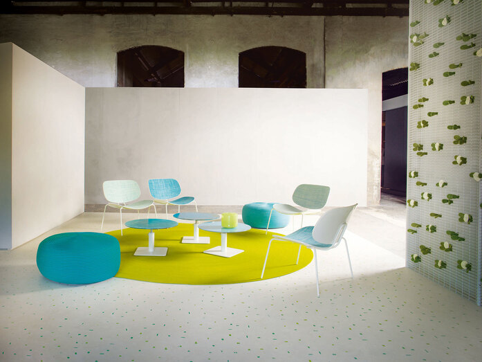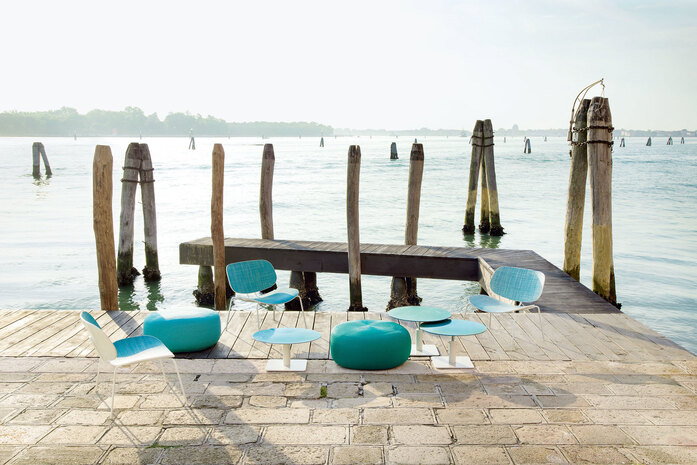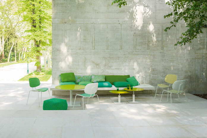 Lido is a collection of innovative outdoor furniture composed of chair, armchair, sun bed and table, specifically conceived for a use in public areas and in contract projects. The bearing structures are made of varnished stainless steel in gloss white colour. The seat areas, the backrests and the parts composing the sun bed are made of Diade, the new Paola Lenti signature molded plastic material, recyclable and available in several colours. All pieces in the collection are stackable; the sun bed is provided with wheels and with adjustable backrest.