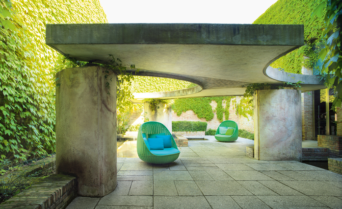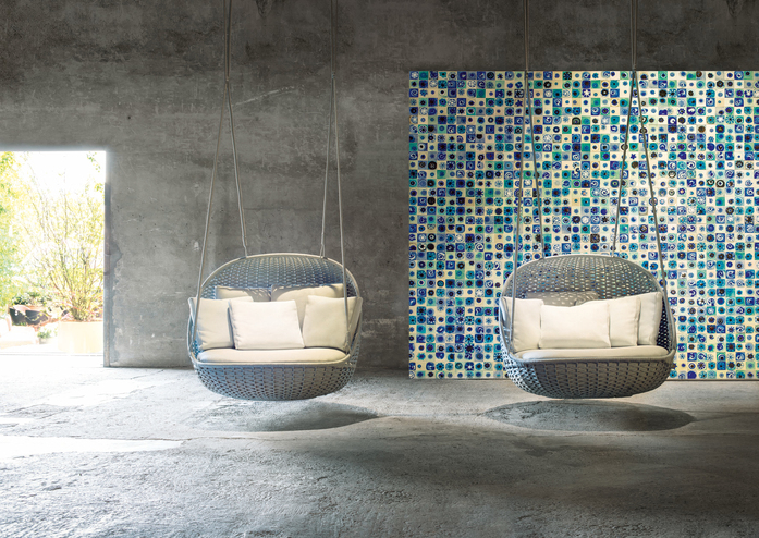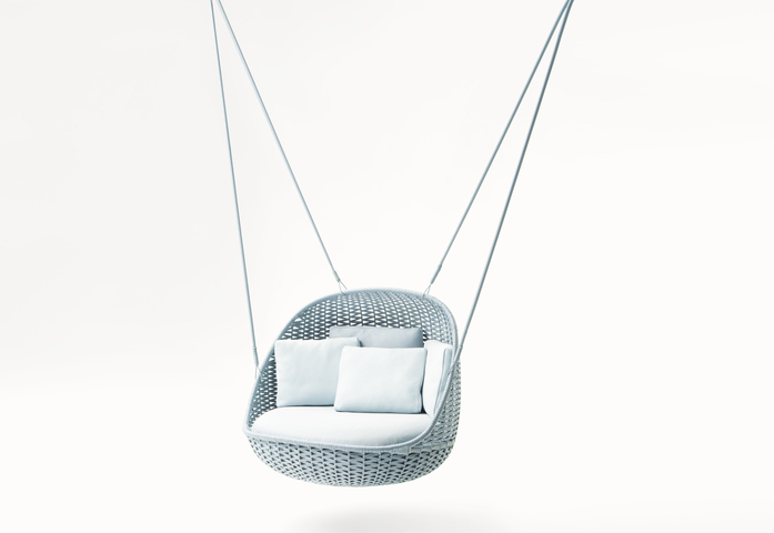 The seating Orbitry consist of a stainless steel structure, which is hand woven with a flat one or two-colour braid in Rope yarn. The seating cushion is made of polyurethane foam and polyester fiber, upholstery cover is removable and available in the outdoor fabrics in the collection. The series Orbitry includes a wide armchair, swiveling on its own axis, and a suspended seat, provided with multi-wire cables in stainless steel covered with a Rope braid.
