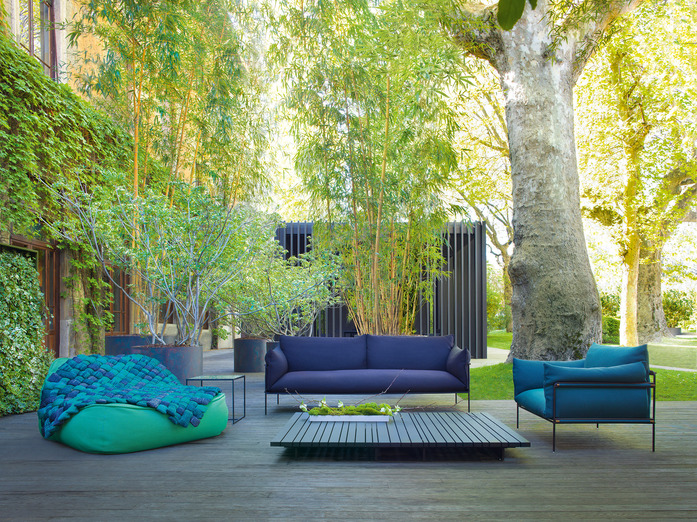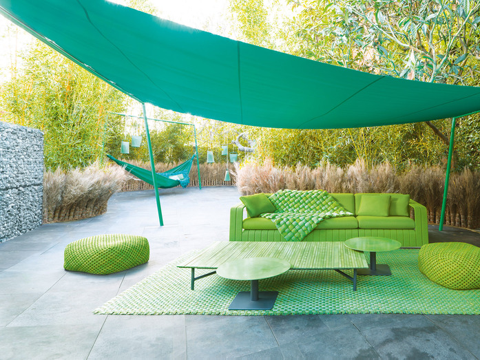 Pad suitable for the outdoors made weaving by hand elements in Chain Outdoor, a mélange tubular knit exclusive to Paola Lenti, padded in polyester fibre.