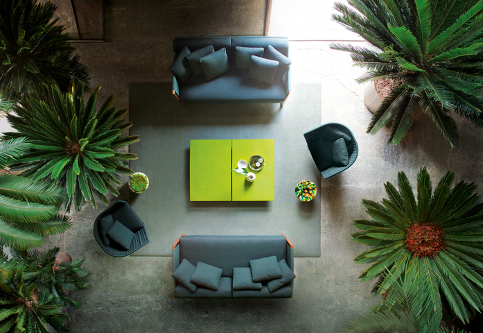The sofa Portofino feature a structure made of natural or dark dyed black locust heartwood covered with Paola Lenti’s signature fabric Madras or Tamil. The seat is provided with elastic belts. Seat and back cushions have a removable upholstery in a colour matching the structure covering.