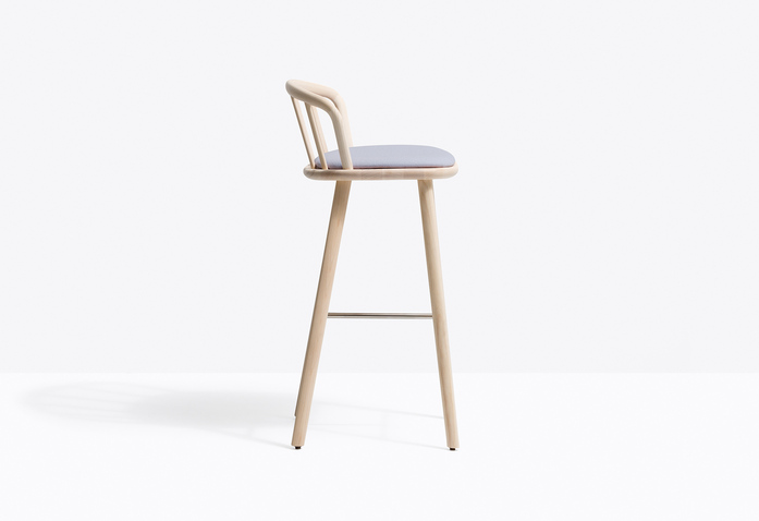 Der Hocker Nym greift den konstruktiven Archetypus der englischen Windsor-Sitze auf, der durch die Logik der industriellen Produktion neu interpretiert und vereinfacht wird. Die gekurvte Rückenlehne aus gebogenem Holz mit elliptischem Querschnitt verbindet sich durchgehend mit dem Sitz aus geformtem, massivem Eschenholz und gepolsterter Sitzfläche und wird zur Armlehne. Struktur mit vier Beinen aus massivem Eschenholz und Fußstütze aus Edelstahl. Höhe 775 mm.