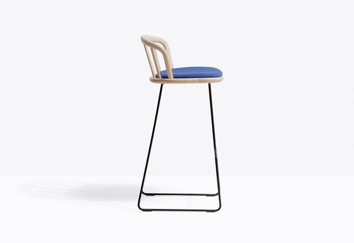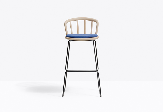 Der Hocker Nym greift den konstruktiven Archetypus der englischen Windsor-Sitze auf, der durch die Logik der industriellen Produktion neu interpretiert und vereinfacht wird. Die gekurvte Rückenlehne aus gebogenem Holz mit elliptischem Querschnitt verbindet sich durchgehend mit dem Sitz aus geformtem, massivem Eschenholz und gepolsterter Sitzfläche und wird zur Armlehne.