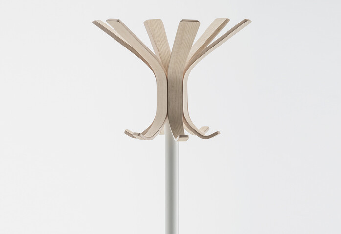 Ray ist ein freistehender Kleiderständer, der durch seine fluide Form in der Lage ist, die Schönheit von Eschenholz hervor zu heben und diese mit der Funktionalität eines Objekts für den täglichen Gebrauch zu vereinen. Die Hacken aus mehrschichtigem Sperrholz, die an von der Natur inspirierte Wedel erinnern, sind mit einer Säule aus Stahl verbunden.