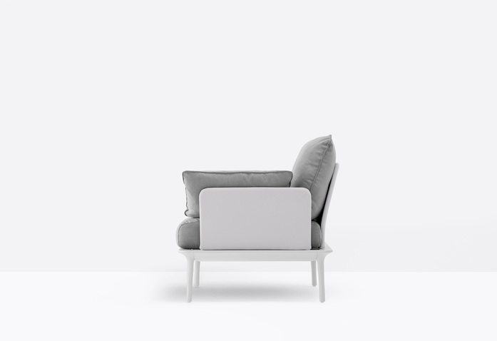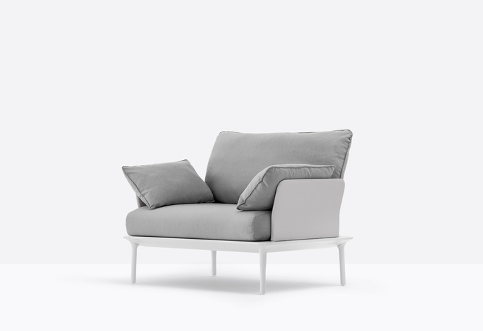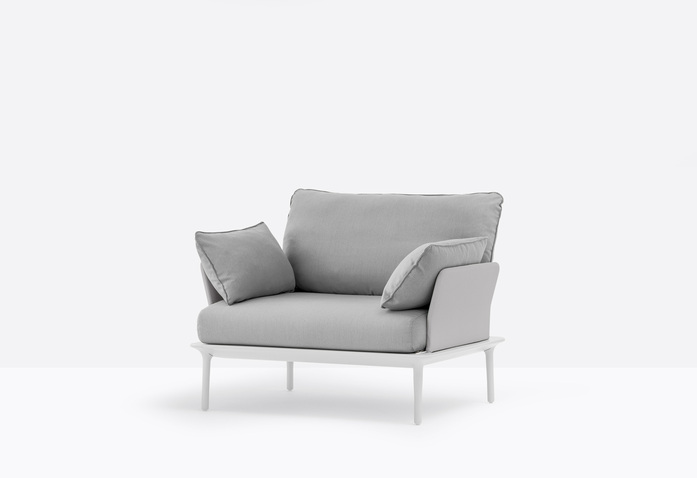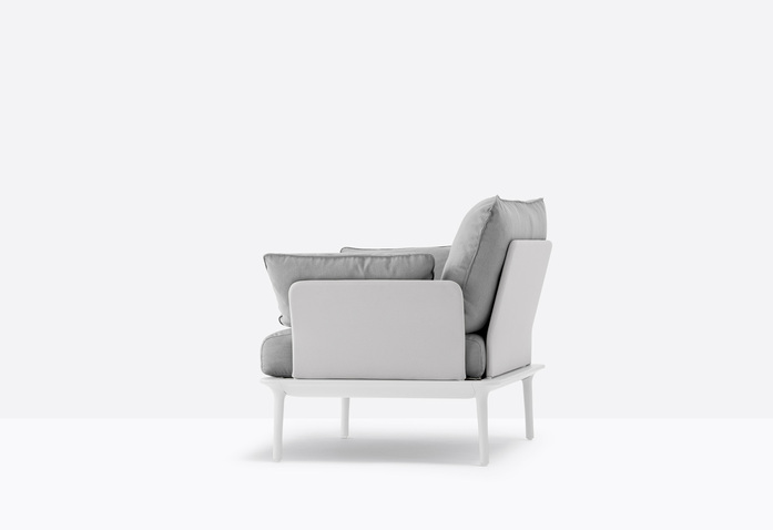 Reva ist eine Outdoor-Kollektion, die sich durch weiche Linien und großzügige Abmessungen auszeichnet. Lounge-Stuhl, mit einem dünnem Rahmen aus druckgussgepresstem Aluminium mit vier sich verjüngenden Beinen aus druckgussgepresstem Aluminium, die das klare Design unterstreichen. Kissen aus gedrucktem Polyurethanschaum, mit wasserdichtem Stoff bezogen.