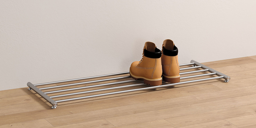 Die Idee zu unserem ersten Entwurf für ein Schuhregal kam von einer Architektin, die eine passende Ergänzung zu unseren Wandgarderoben suchte. Heute bieten wir eine Serie von hochwertigen Schuhregalen in Edelstahl an, jedes Element seidenmatt geschliffen. Die Regalböden sind individuell positionierbar - wobei der oberste Regalboden ein Fixelement darstellt. Das klare, zeitlose und zurückhaltende Design lässt sich mit jeder Inneneinrichtung kombinieren und ist langlebiger Begleiter. In Kombination mit den PHOS-Garderoben ergeben sich vielfältige Gestaltungsmöglichkeiten. Mit höhenverstellbaren Füßen zum Ausgleich von Bodenunebenheiten. In verschiedenen Standard-Höhen und -Breiten erhältlich. Individuelle Maße auf Anfrage.