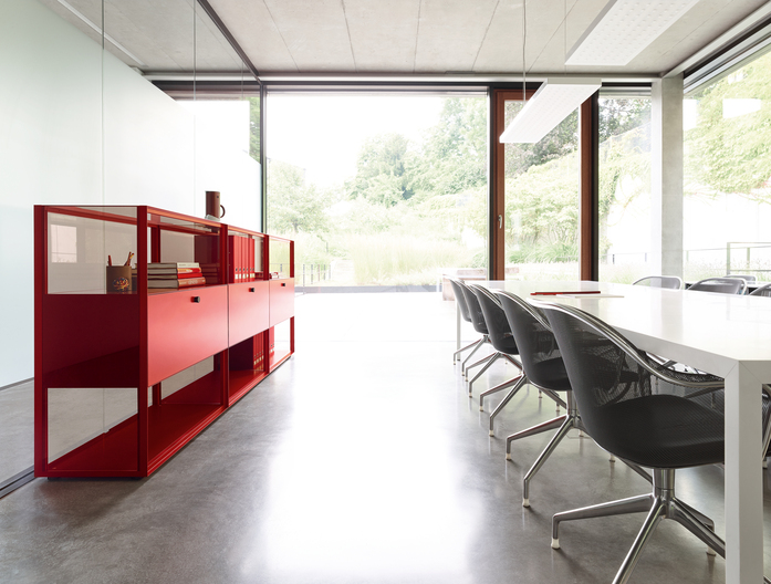 Schmale Aluprofile, farbig oder verchromt, Lochbleche und farbiges Glas: Mit MESH entsteht ein Farb- und Lichtspiel aus planen und strukturierten Flächen, das für eine lichtdurchlässige, freundliche Atmosphäre im Büro sorgt. Dabei besticht das Programm durch die piure-typische, luxuriöse Ausführung der einzelnen Elemente und Details.