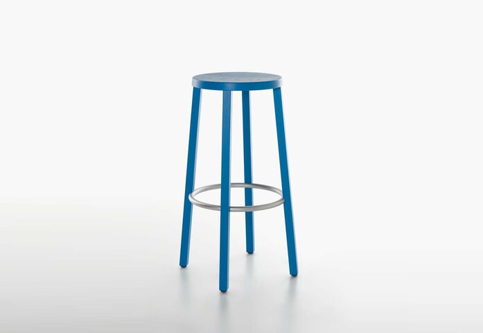 Barhocker aus Esche Natur lackiert, schwarz gebeizt lackiert oder offenporig decklackiert in den Farben grau, weiss und blau. Ring in Edelstahl gebürstet. Versionen: Stuhl, Armlehnstuhl, Barhocker.