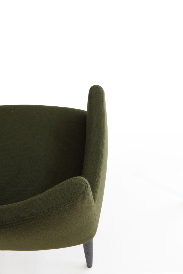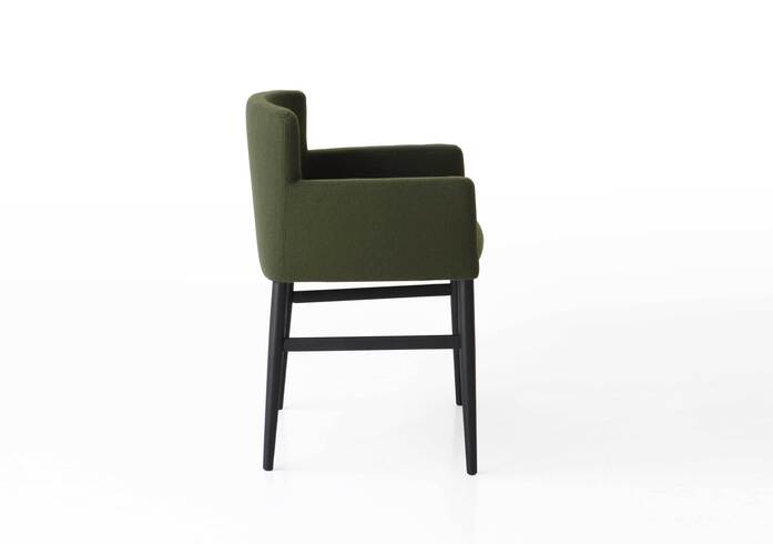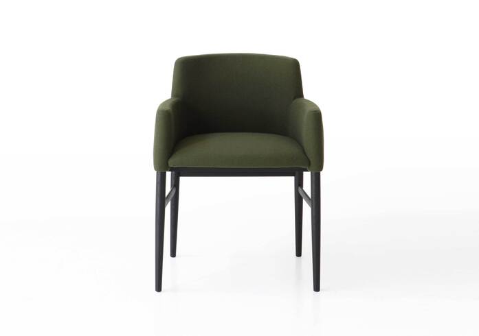 The new padded Pioggia chair, a contemporary interpretation of the classic wood chair, belongs to the same family of the Neve chair and the Ghiaccio armchair. Its streamlined legs, available in natural, black stained, red stained and white stained solid ash, remain visible, conversing with the soft fabric or leather covering that perfectly suits the seat and the armrests, covering them. Essential yet distinctive project, to be personalized in the mix of materials, it can be declined in a totally black key, in delicate nuances or daring with color, bringing a new convenience and expressive possibilities to the dining room and work areas