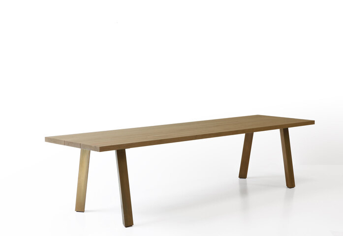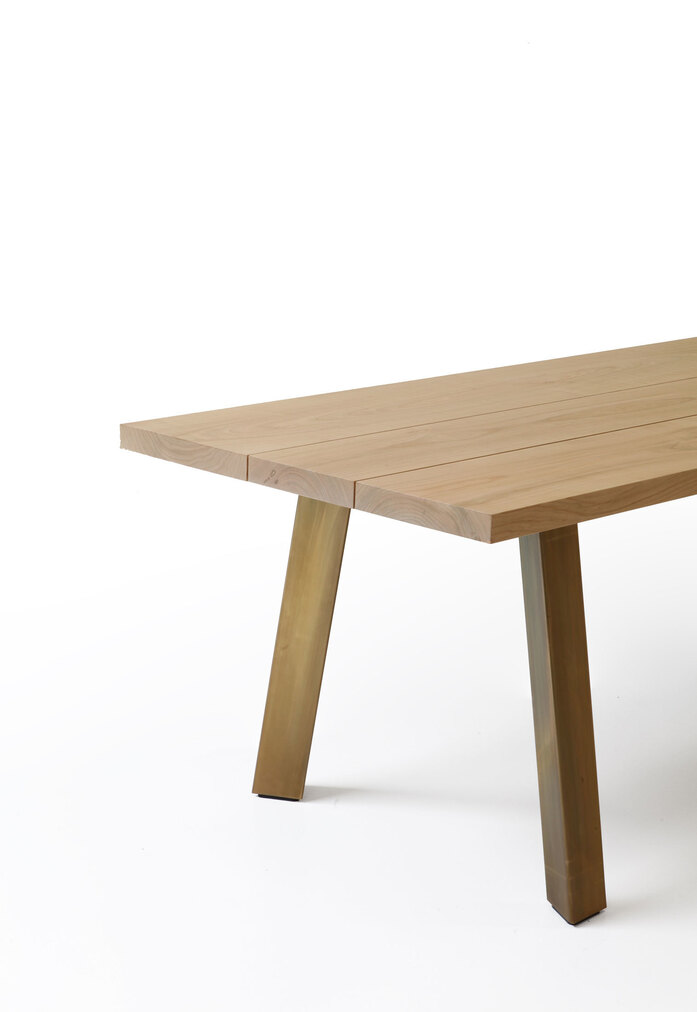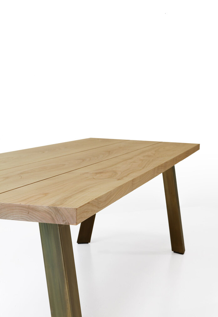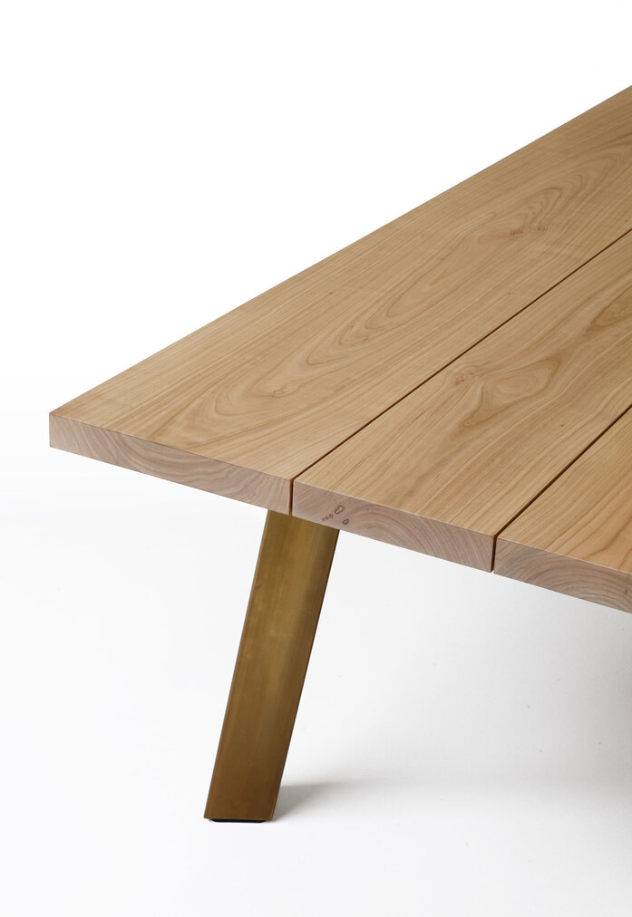 The new Ryoba table by Piero Lissoni pays homage to the naturalness of materials and the beauty of imperfection, with a drawn brass tube frame and top in European cherry wood. The very thick triangular legs create an easel on which the substantial top rests: three solid wood boards, each slightly different from the other, simply assembled without glue with a subtle tapering. The Franciscan proportions of the table, which is narrow and long to respect the natural size of the trunks, invite to a new intimate conviviality, while the exposed cracks and tiled knots underscore the poetry of this beautiful traditional wood which takes on a new life and becomes contemporary.
