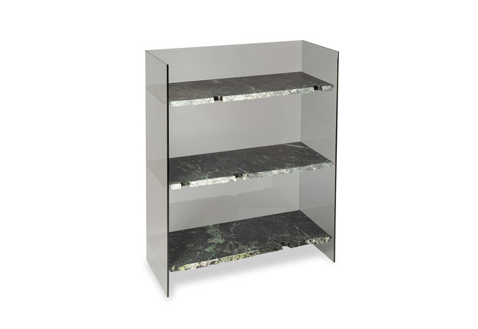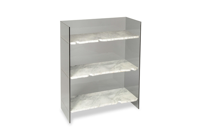brut shelves: Combining a smooth glass exterior with raw cut marble, the brut shelves are an exercise in contradictions. The heavy marble shelves appear as if to float within the structural glass exterior, with a raw cut front to the off-cut marble slabs further emphasising a unique combination of elements and textures, bringing together varying degrees of colour, texture and transparency into this captivating series.