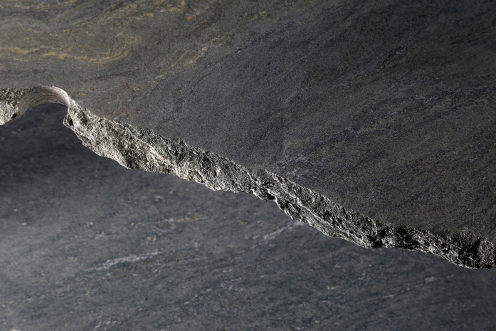 The shelves are produced from off-cut marble slabs with a raw cut front edge. The frame of