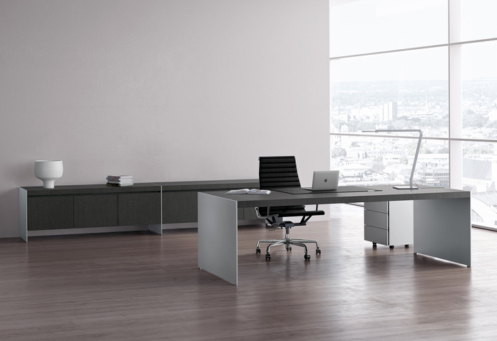 Minimalismus als Prinzip. Formale Ruhe und Klarheit. Eigenständige Unaufdringlichkeit. Schlanke Wangen aus Aluminium oder Korpusse in unterschiedlichen Dimensionen tragen scheinbar mit Leichtigkeit eine 60 mm starke Tischplatte. Meisterhafte Verarbeitung zeigt sich im Furnierbild, das sich fugenlos über die Tischkante zieht. Es gibt zahlreiche Tischplattengrößen und Winkellösungen, rechteckige und runde Besprechungstische, Container sowie Highboard-und Sideboardelemente. Container und Boardmodule bieten organisatorische und praktische Details. Wandpaneele in zwei unterschiedlichen Größen gliedern und strukturieren Räume. Edle Materialien wie ausgewählte Hölzer und Metallic-Lacke eröffnen gestalterischen Freiraum für eine persönliche Nuancierung.