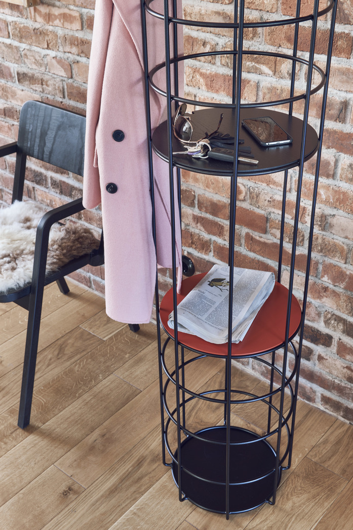 Variantenreich. Die Garderobenserie Bazar besteht aus einer Stehgarderobe sowie drei Wandversionen. Alle Varianten sind aus pulverbeschichtetem Stahl gefertigt, das in Schwarz, Grau, Weiß, Blutorange und Narzissengelb erhältlich ist; ebenso die Haken. Die Einlegeböden für die Stehgarderobe können aus lackiertem MDF, Schwarz lasierter Eiche oder Eiche natur gewählt werden. Diese sind mit einer kleinen Aussparung versehen und lassen sich somit einfach von oben einsetzen und auf jeder beliebigen Höhe platzieren. Dank dieser Lösung ist auch im Inneren der Garderobe ausreichend Platz zum Ablegen und Aufbewahren.