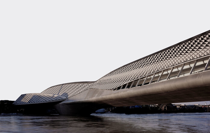 Der „Zaragoza Bridge Pavillon“ besteht aus vier Elementen, die sich wie Blütenblätter überlappen und im Querschnitt die Form eines Diamanten einnehmen. Inspiriert von der unendlichen Formenvielfalt der Natur öffnet sich der Pavillon zum Ufer im Stil einer Gladiolenblüte.