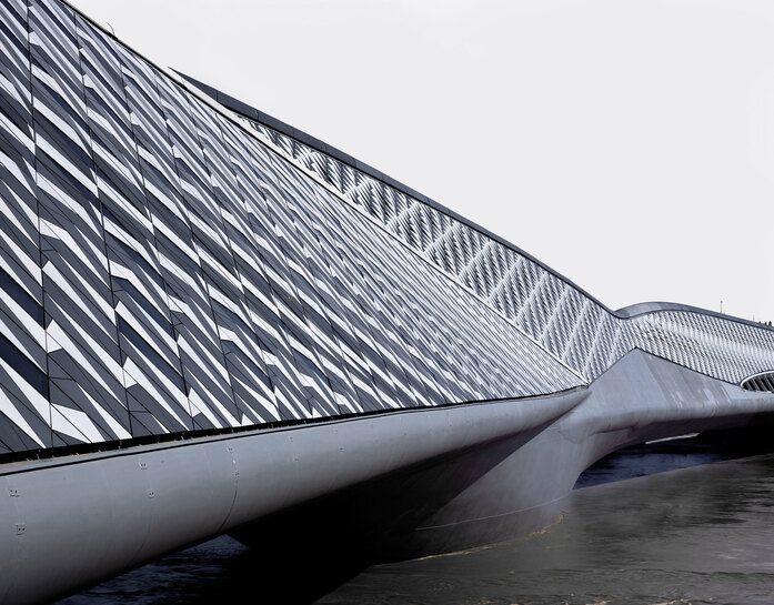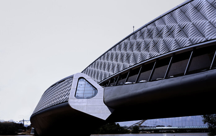 Die britische Stararchitektin Zaha Hadid hat sich bei dem 275 Meter langen „Zaragoza Bridge Pavillon“, dem Symbol der Expo 2008 im nordspanischen Zaragoza, für Glasfaserbeton von Rieder entschieden. Die Außenhaut des Bauwerks wurde mit 29.000 Dreiecken aus concrete skin in neun verschiedenen Graunuancen verkleidet. Ein raffiniertes Muster der glasfaserverstärkten Betonplatten in den unterschiedlichsten Grautönen erzeugt einen Effekt wie bei schimmernden Schuppen von Fischen.