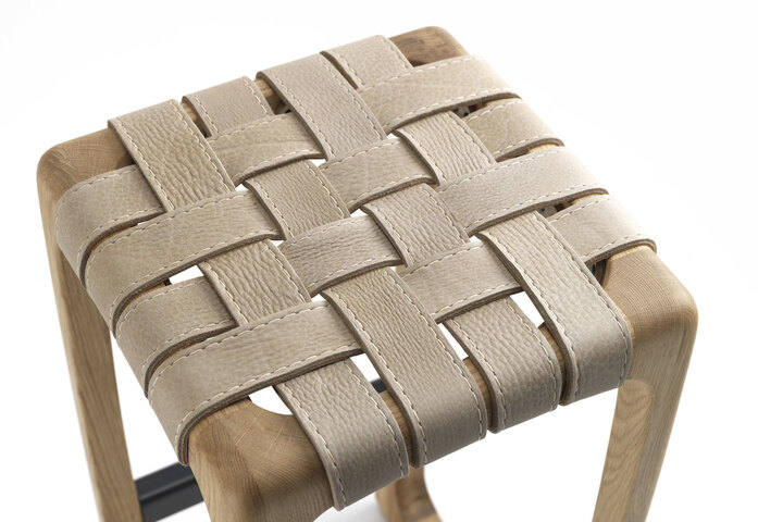 Barhocker bestehend aus einem Gestell aus Massivholz, von Hand gebaut und geschliffen, mit einer Fussstütze aus Eisen. Sitzfläche aus Gürteln in Leder Utah. Mittels Öl oder Wachs pflanzlichen Ursprungs mit Kiefernextrakten endbehandelt.