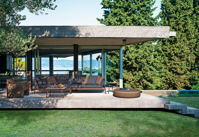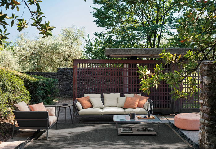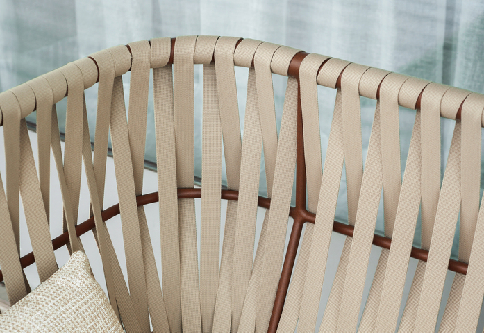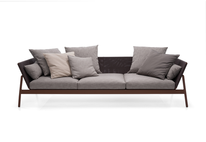 Die Sofas PIPER, die durch die Verwendung von doppeltem Material Aluminium/Riemen für die Version mit hoher Rückenlehne und von Aluminium/Batyline für die Variante mit niedriger Rückenlehne charakterisiert sind, fügen im Angebot von RODA neue, nie zuvor gesehene Zusammenstellungen von Farben und Tönen ein, welche das Sofa aufwerten und es verstehen, durch ein Design voller Persönlichkeit und großem Charakter eine innere Harmonie mit der Natur aufrechtzuerhalten. Dabei treffen wir auf das Debüt Rust, eine anspruchsvolle Feinbearbeitung in rostbrauner Farbe, welche einen strengen Aufbau begleitet, gemischt mit der Weichheit von Strukturgeweben und geschmackvollen Kissen für Indoor-Linien, die mit Nonchalance im Freien eingesetzt werden können. Rust ist eine besondere Farbgebung, quer und vielseitig, die perfekt auf alle Farbvarianten der neuen Rückenlehne abgestimmt ist: von Sand- und Brauntönen zu den etwas bunteren und gemischten Tönen von Orange und Blau, die sowohl an den Beschichtungen mit Batyline, als auch bei der Version mit niedriger Rückenlehne im Zusammenspiel mit verwebten Polyesterbändern stehen.