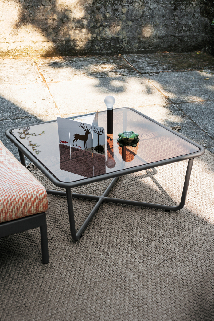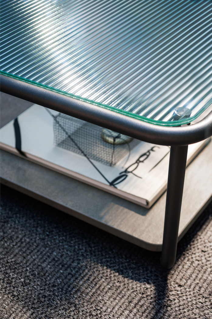 The glass top comes in two finishes: crystalline with a particular ribbed design and bronze, paired with a painted metal frame available in several colours: smoke, milk or the new rust finish.