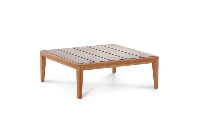 The mingling of different materials spotlights all the expressive force of teak which is mixed with outdoor fabrics and canatex nets for seats along with an original slatted effect in natural gres or glazed gres for tops.