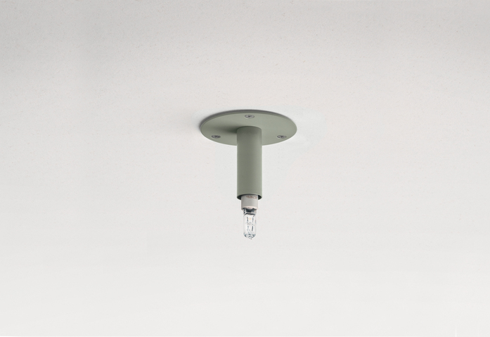 Halogenlampe aus Stahlrohr, zur Installation an der Decke. Maße cm: 9 Länge (13,5 inkl. elt. Birne), Scheibe 10 Ø. Farben: Zinkgelb RAL 1018 / Grauweiß RAL 9002 / Steingrau RAL 7030