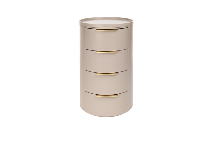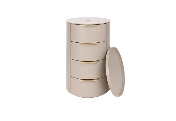 Rundkommoden auf Rollen in acht verschiedenen Versionen und zwei unterschiedlichen Größen. Die Kommoden unterscheiden sich durch verschiedene Kombinationen bestehend aus offenen Bereichen, teilweise mit Glasablagen versehen und Schubkästen in drei Größen, sowie zwei Griffvarianten. Verschiedene Abdeckplatten und Tablare, wahlweise aus MDF lackiert oder furniert, Massivholz, Glas oder Metall. Tablare optional schwenkbar. Optionale Inneneinteilung der Schubkästen als Barkommode für Flaschen und Gläser.