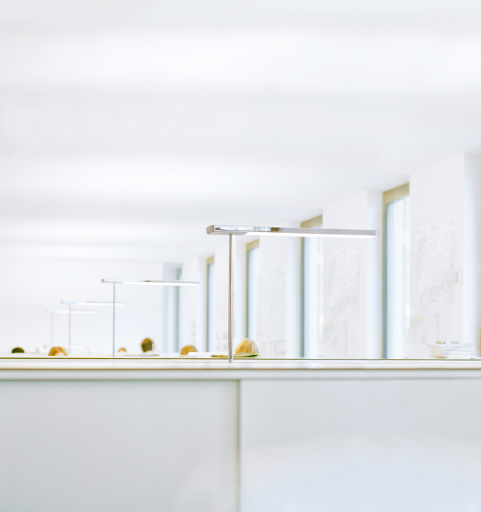 SLICE² entwickelt die erfolgreiche SLICE technisch, funktional und formalästhetisch weiter. Der komplett geschlossene Leuchtenkopf sorgt mit einer besonders innovativen Anordnung der Leuchtmittel auf zwei Ebenen für eine optimale Lichtwirkung: Breit nach oben abstrahlende LED Streifen bieten indirektes, auch bei voller Leistung absolut blendfreies Licht. Nach unten sorgen LED-Leuchtmittel, deren Licht über die Glaskanten eingespeist und von einer prismatischen Scheibe verteilt wird, für ideales, direktes Licht auf der Arbeitsfläche. SLICE² wird so zu einer perfekten Lichtlösung für alle Anforderungen moderner Büroarbeitsplätze hinsichtlich Lichtleistung und Entblendung.