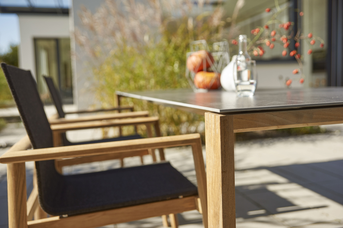 Das Design von SAFARI ist geprägt durch einen geradlinigen Teakrahmen aus fein profilierten Hölzern, in den eine ergonomisch geformte Sitzschale aus hochwertigem softex Gewebe eingespannt ist. Charakteristisch sind die handwerklich aufwendig gezinkten Verbindungen. Das unbehandelte, zertifizierte Teak verleiht der Serie eine natürliche Wärme.