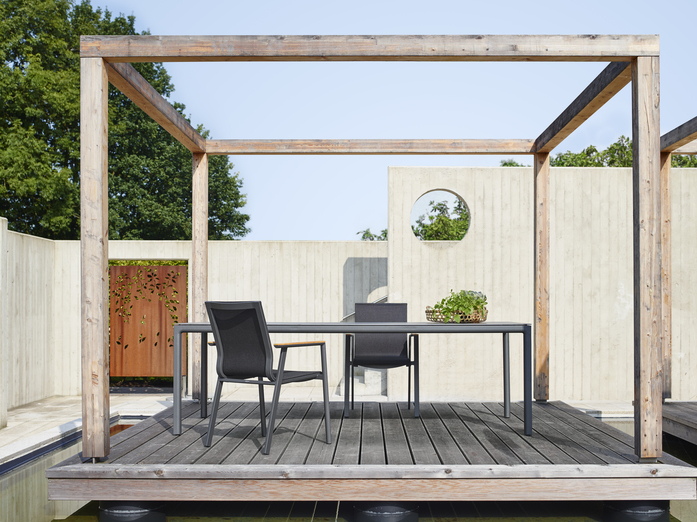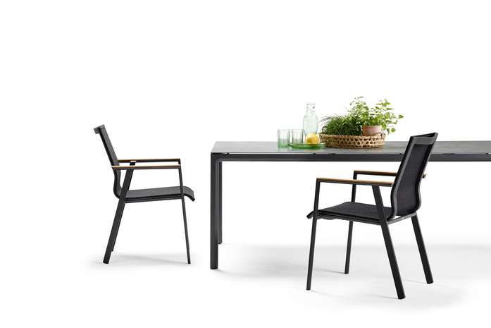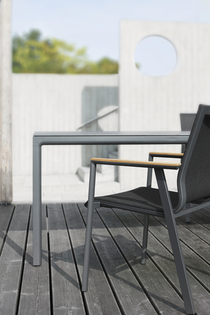 Das Design vom Stapelsessel SOUL ist geprägt von einer durchgehenden, sanft geschwungenen, ergonomisch geformten Sitzschale, welche getragen wird von einem geradlinigen Aluminium-Gestell. Markant sind die fliegende Armlehne, wahlweise mit taktilen Teak- oder farblich passenden Aluminium-Applikationen, sowie die aufwendigen Profile mit handschmeichlerischen Rundungen.