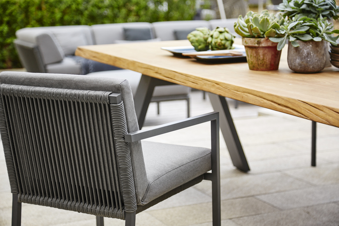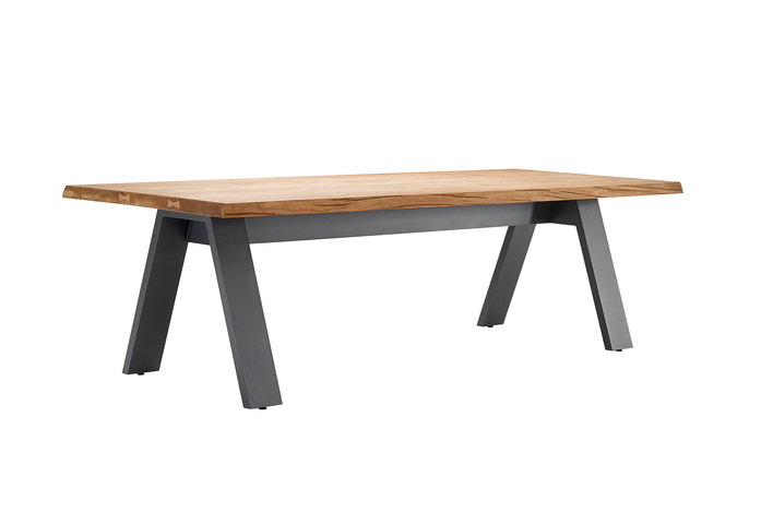 Charakteristisch für TIMBER sind die in der natürlichen Form eines Baumstammes belassenen Außenkanten der massiven und durchgehenden Teakplatte. Getragen wird die Tischplatte von soliden Beinen aus Aluminium, die in einer umgekehrten V-Form angeordnet sind. Jede Teakplatte ist ein Unikat mit naturgegebener Maserung sowie individuellem Kantenverlauf und lebt von seiner Patina.