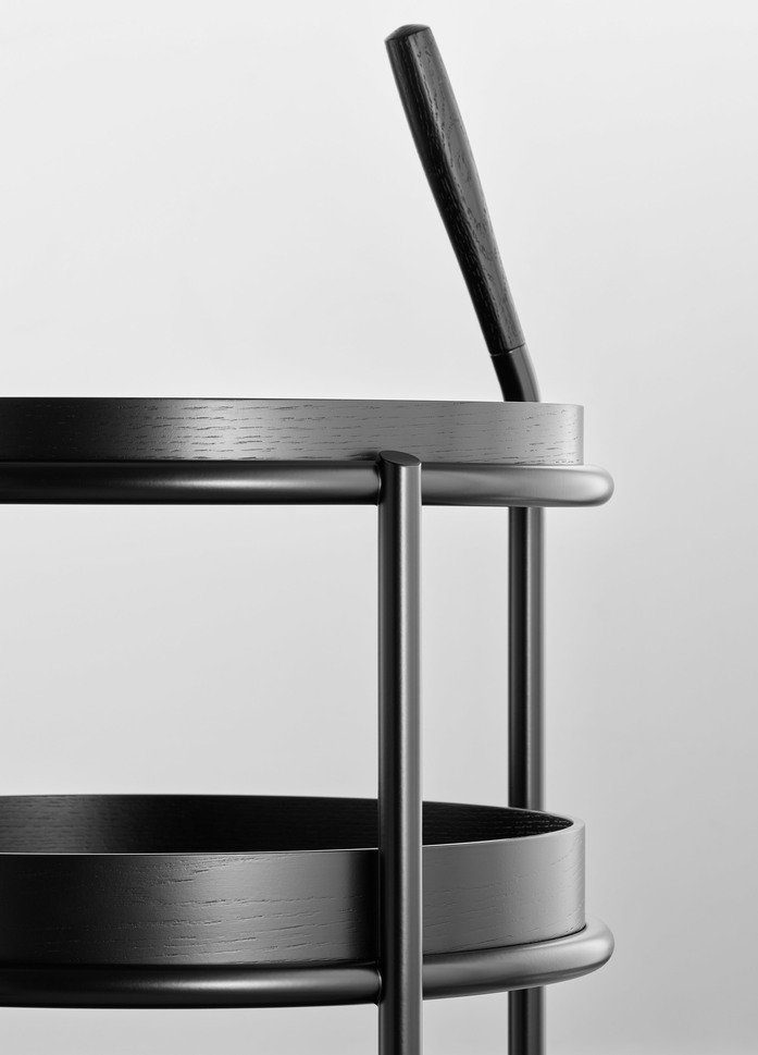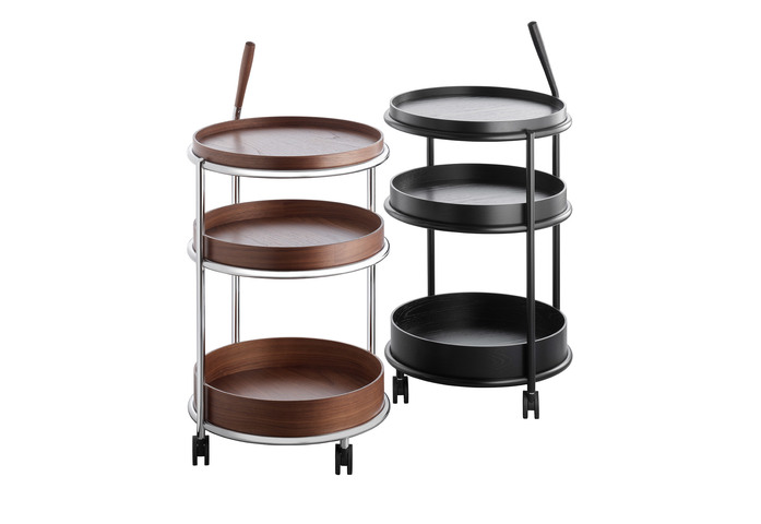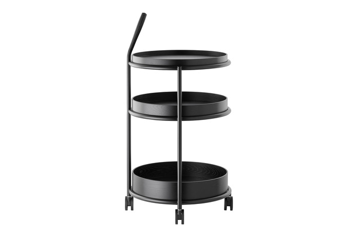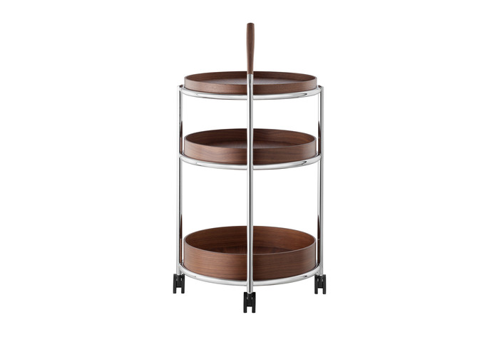 Der neue Trolley K6 für Tecta ist durch seine Rollen flexibel einsetzbar und gleitet als beweglicher Beistelltisch ans Sofa, den Esstisch oder durchs Office. Er besteht aus verchromtem oder pulverbeschichtetem Rundrohr, seine drei Tabletts – und das ist der Clou- sind abnehmbar, aus Esche furniertem Sperrholz gefertigt und können mit unterschiedlichen Höhen multifunktional eingesetzt werden. Ein Augenzwinkern erlaubt der Griff, der nicht nur zufällig an Reisegepäck erinnert und aus offenporig lackiertem Holz besteht.