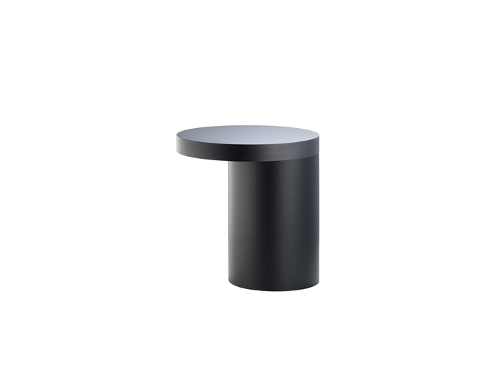 Dieser Tisch ist nicht nur ein Tisch. Die schwarz durchgefärbten MDF-Reifen liefern Struktur. Die Tischplatten, zur Seite auskragend und drehbar, schaffen Abstellflächen und geben den Blick ins Innere frei. »Alles was zum Vorschein kommt, soll schön sein,« ist Hartauer’s Credo. Das Innen überrascht: minutiös verarbeitet, die Bewegung möglich durch eine Spindel aus Edelstahl, die sich auf Gleitlagern lautlos drehen lässt. Perfekt wie ein Uhrwerk.