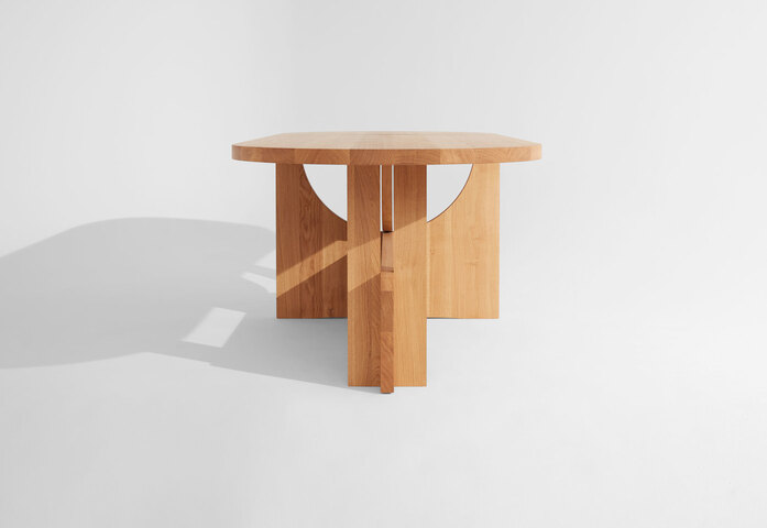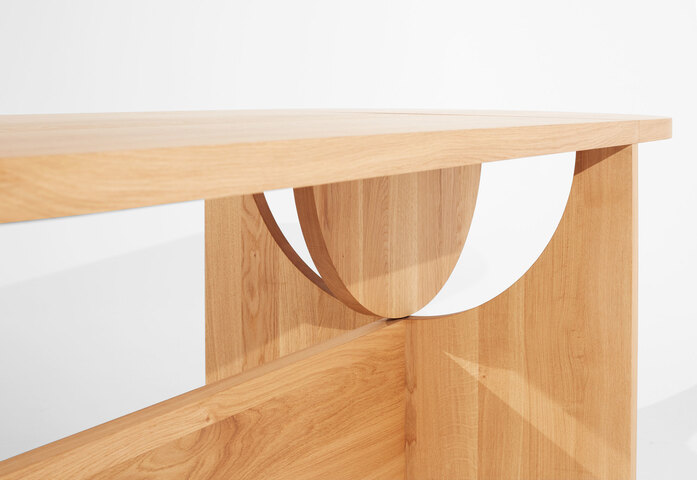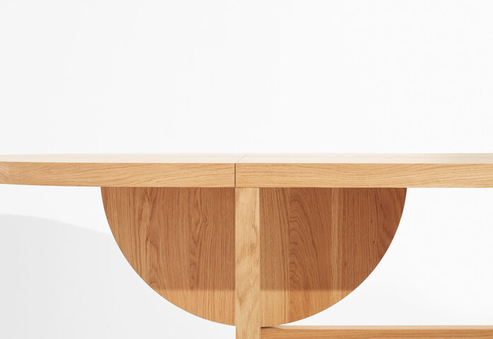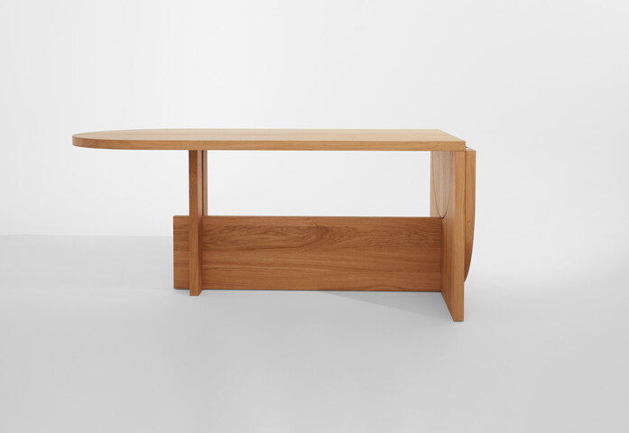 Der Name Lot ist für Hartauer eine Referenz an den rechten Winkel. Sein Tisch mit dem Klappmechanismus zugleich ein Spiel mit Geometrien: ein Halbkreis, der um 90 Grad gedreht wird und die Auflage für das Klappelement bildet. Hartauers Idee: eine Bewegung zu kreieren, die man dem Möbel ablesen kann. Lot ist wandelbar: er kann sowohl Ess- als auch Arbeitstisch sein.