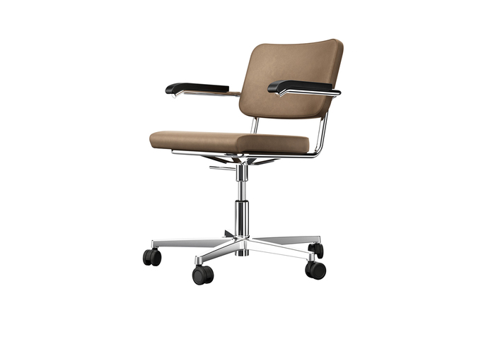 Die Arbeitswelt verändert sich – Home-Offices, Studio Offices, das sind Orte, an denen Mobilität, Flexibilität und Kommunikation eine entscheidende Rolle spielen. Orte auch, an denen Möbelklassiker, die modernen Lebensentwürfen gerecht werden, ihren Platz haben. Hierfür macht Thonet eine bereits um 1928 entstandene und in ihrer Formensprache bis heute gültige Ikone klassischer Möbelgestaltung mobil – seinen Stuhl S 64 von Marcel Breuer. Zur imm cologne 2019 präsentiert Thonet diesen berühmten Freischwinger als Drehstuhl mit einem Zentralfuß auf Rollen. Als S 64 Atelier lässt sich dieser Klassiker mit neuer Funktion in privaten Arbeitsbereichen ebenso einsetzen wie in Arbeits- und Kommunikationszonen moderner Büros. Beim S 64 Atelier hat man an ein Konzept Breuers angeknüpft, dem unter anderem in dem historischen Thonet-Stahlrohrkatalog von 1935 andere Stahlrohrstühle mit einem Drehgestell zugeschrieben sind und bei denen das Design eines Freischwingers mit der Funktion eines Drehstuhls kombiniert worden war.