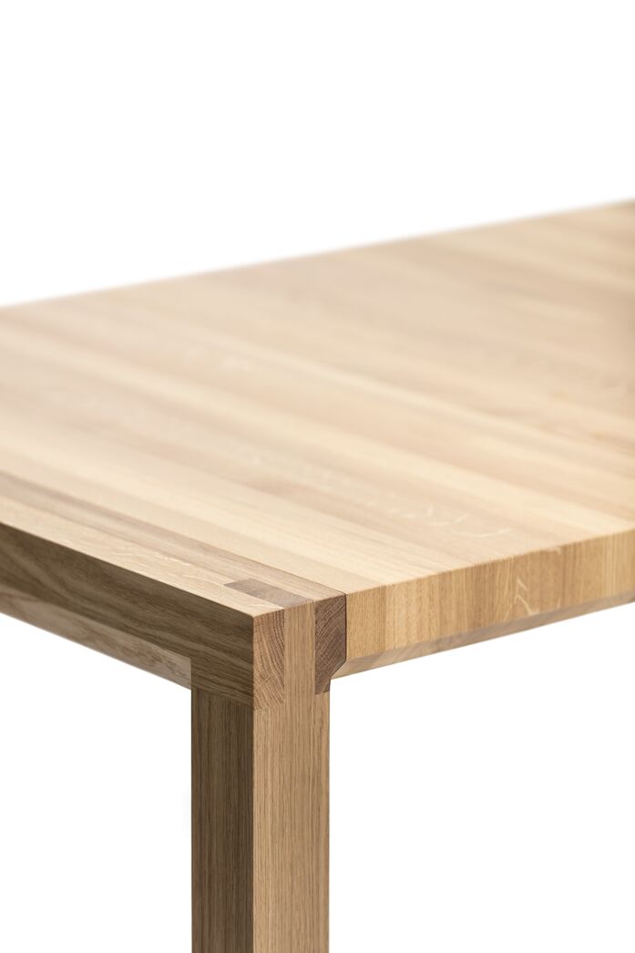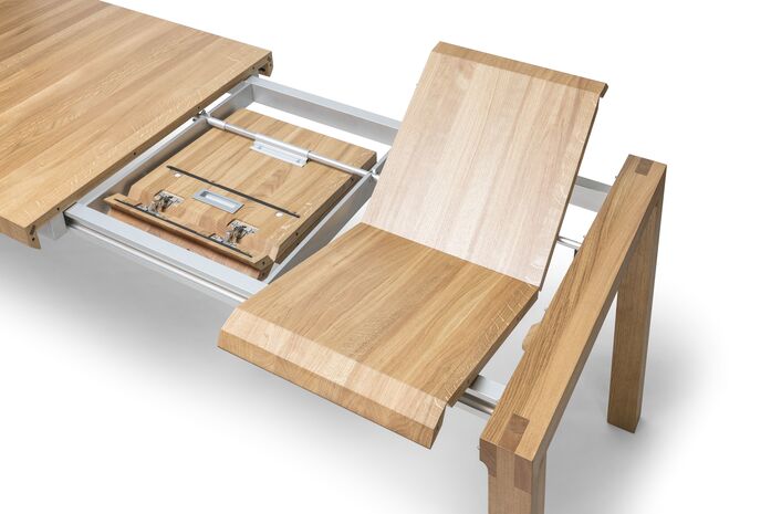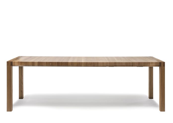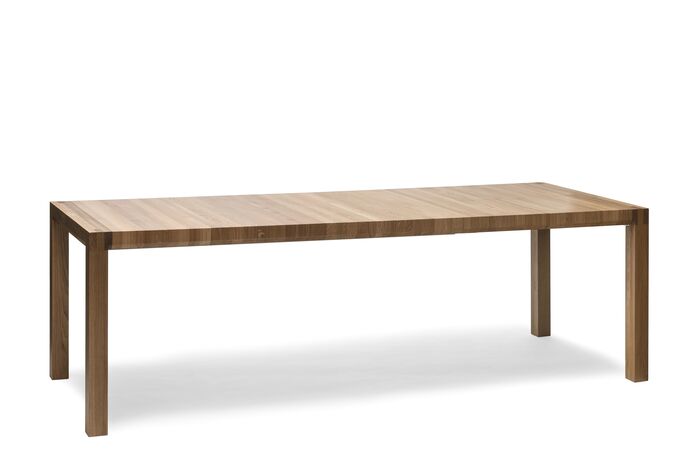 Massiver Holztisch, der ewig hält. Nicht nur dank der hochwertigen Verarbeitung, sondern auch durch die zeitlose Formen. Die Tischplatte besteht aus ungewöhnlich horizontal gelegten, seitlich elegant geschliffenen Segmenten. Die praktische Ausziehvariante bietet beim Mittagessen der ganzen Familie Platz. Zum Tisch können auch Stühle oder Sessel mit Armlehnen verwendet werden.