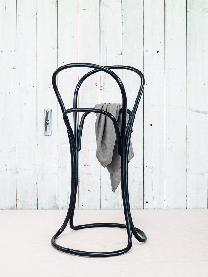 Das Design dieses stummen Dieners wurde durch die Form von Blütenblättern inspiriert. Die Schöpferin hat sie in vier gebogene Buchenkanthölzern übertragen. Die Ablagestellen sind mit Paspeln ausgestattet, die das Abrutschen der Kleiderstücke verhindern.