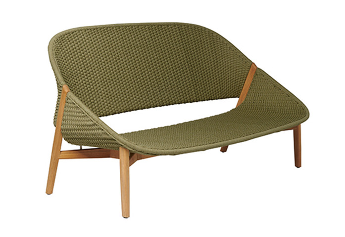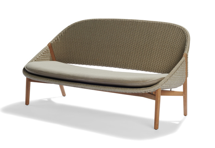 Beim Zweisitzer, der die warme Umarmung des Elio-Designs um einen bequemen Sitz erweitert, verlängert die sanft geschwungene Rückenlehne den Sitz zum perfekten kleinen Sofa. Der Rahmen besteht aus natürlichem Teakholz, das die Sitzschale vor allem durch die Hinterbeine stützt. Die handgewebte Rückenlehne und die tiefe Sitzfläche ziehen sich nach oben und innen, um ein warmes, schützendes Gefühl zu erzeugen. In jedem Strang des Tricords sind mehrere sanfte Farbtöne eingewebt, die das natürliche Licht nachahmen und jeden 2-Sitzer einzigartig machen. Das Gewebe ist in den Varianten Linen, Wengé und Moss erhältlich.